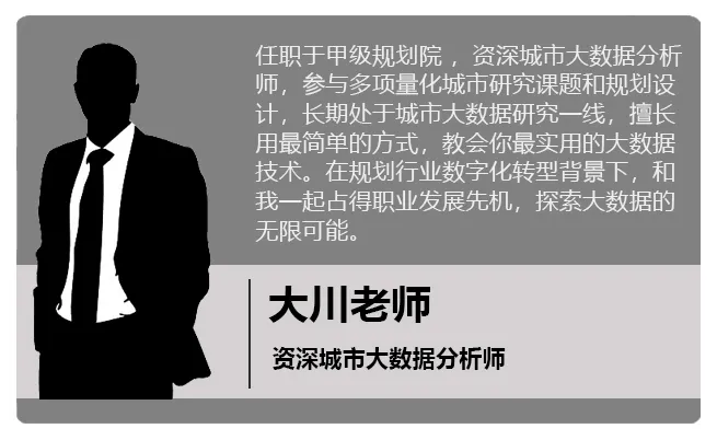 我是大川老师,我参与了省市级规划项目及研究课题30+项,负责团队交通模型仿真、城市大数据、量化城市研究课题等工作,处于规划领域实践一线,有丰富的数据处理场景经验。