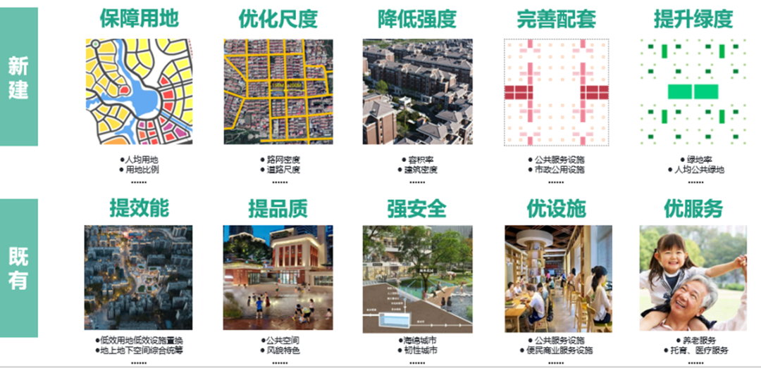 完整社区的建设也有不同类型的建设方式。对于新建住区,关注保障用地、优化尺度、降低开发强度、完善配套设施、提升公共绿地和人均绿地建设指标。对于既有社区更新改造,更加关注提高用地效能,提升公共空间品质,加强安全韧性、优化设施功能,为居民提供家门口的优质服务,更加关注人的需求。