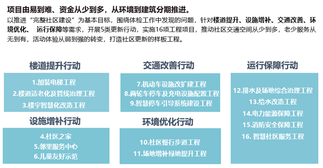 以循序渐进、持续更新的方式不断完善建设实施方案。试点社区遵循持续更新的方式,在摸清社区风险隐患轻重缓急的基础上,形成项目库,有序推进项目从环境到建筑分期建设实施。以推进“完整社区建设”为基本目标,围绕体检工作中发现的问题,针对楼道提升、设施增补、交通改善、环境优化、运行保障等需求,开展5类更新行动,实施16项工程项目,推动社区交通空间从少到多,老少服务从无到有,活动体验从弱到强的转变,打造社区更新的样板工程。