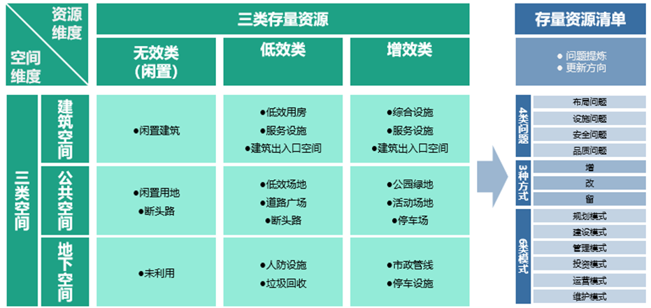 在策划理资源方面,结合全国试点社区调研情况,社区资源可分为空间和资源两个维度空间维度包括建筑空间、公共空间和地下空间三类空间,资源维度包括无效类、低效类和增效类三类资源。通过厘清空间和存量资源的问题,有助于明确更新方向,进而形成存量资源清单,包括布局、设施、安全、品质四类问题增、改、留三种方式,以及规划、建设、管理、投资、运营、维护六类模式