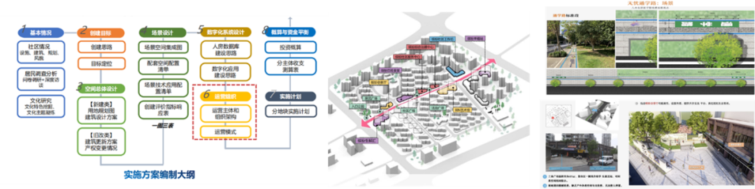 在编制实施方案时,试点社区通过对不同资源的挖掘,形成存量资源清单并结合实际编制建设方案,因地制宜,挖掘空间,提升品质,以确定相应的建设方式以及前置运营策划和年度实施计划。杭州试点社区整合了三个社区,通过设计确定实施方案,涵盖社区基本情况、建设目标、建设方式、场地设置、管理运营、资金筹措方案、前置运营策划、年度实施计划等内容,设计团队在设施完善、景观提升、道路优化等方面来开展相应的设计,通过设计提升空间品质。