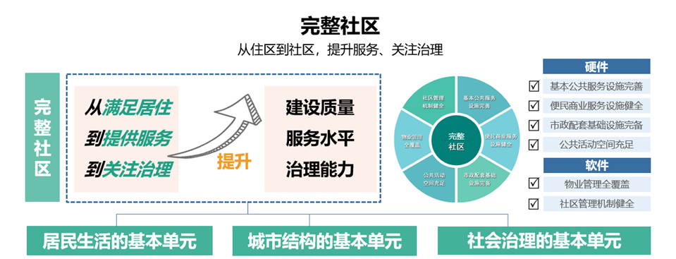 推动完整社区建设的提出,目标是为了从满足居住到提供服务到关注治理,进而提升建设质量、服务水平和治理能力。完整社区建设的六个维度包含居住区标准里所关注的硬件建设,如基本公共服务设施建设、便民商业服务设施建设、市政配套基础设施建设、公共空间等,同时也包括管理治理方面的内容,如物业管理、社区治理。通过构建规模适宜、功能完善的基本单元,进而优化调整城市结构,完善城市功能和激发城市活力。