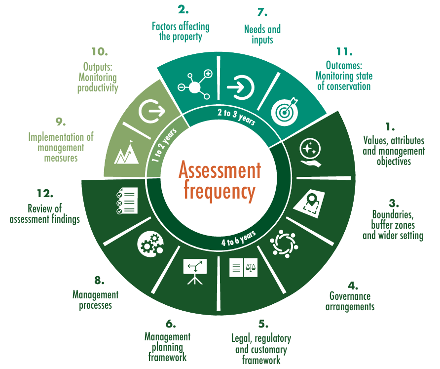 为此,2008年UNESCO发布了基于世界自然保护联盟(IUCN)保护区管理有效性评估框架(PAME)的“提升我们的遗产工具包”1.0版。2023年,在吸收世界遗产体系的发展和遗产保护领域变化的基础上,世界遗产中心及其咨询机构联合发布了升级版的工具包EOH 2.0。作为世界遗产资源手册之一,新的工具包提供了评价世界遗产或其他遗产地管理效果的自评估方法,让遗产工作者能够评估遗产价值的保护和管理目标实现的效果。不同于《实施操作指南》中的定期报告和反应性监测等程序,EOH 2.0作为针对各类遗产地制定的管理有效性自评估方法,是目前最全面的管理评估方法,并可由遗产地管理者直接使用。
