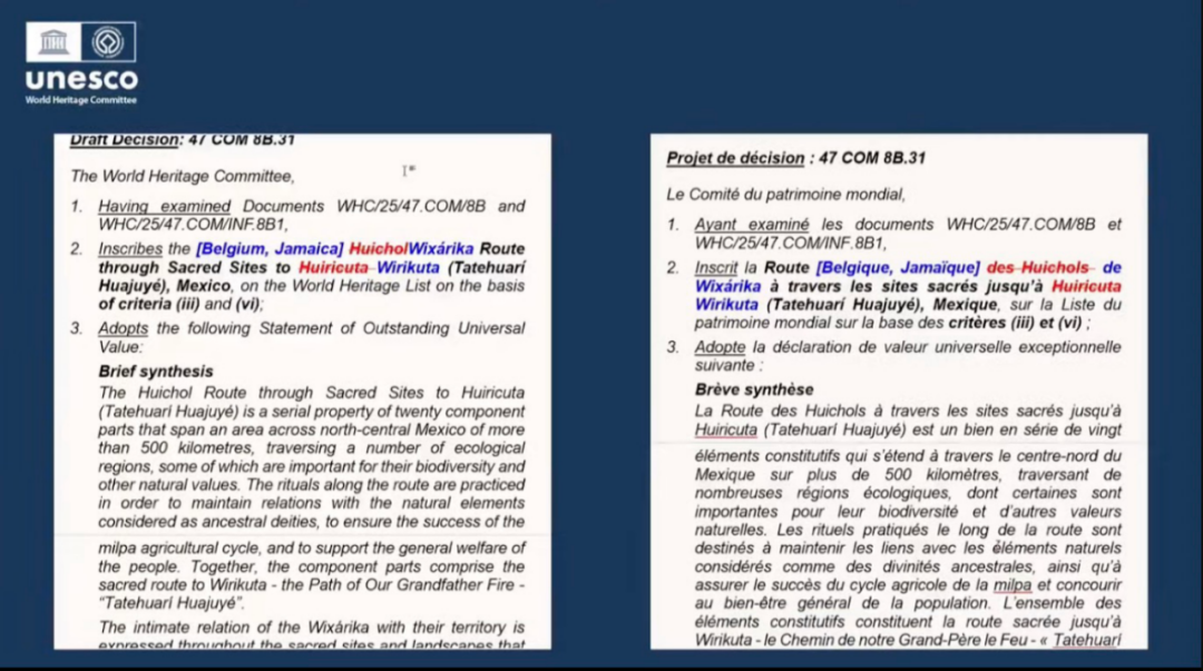 在本届委员会会议的审议中,鉴于咨询机构已“推荐列入”,该项目决议草案并未进行大幅度修订,仅比利时与牙买加提出对遗产地名称的修订,以强调遗产地与维夏里卡原住民的直接联系。这项文化线路经会议审议顺利列入《世界遗产名录》,成为墨西哥第36处世界遗产。在致辞环节,墨西哥国家代表表示将从这条文化线路的神圣景观、动物与森林出发保护维夏里卡生活的世界。