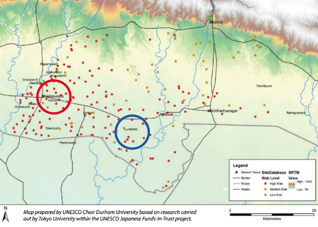 该遗产位于尼泊尔西部台拉地区班甘加河(Banganga River)东岸,保存有形成于公元前6世纪的城市形态考古遗存。其核心为具有网格规划布局的堡垒式”卫城”,周边分布有不同时期营建的住宅区、工业区、宗教活动场所。提名遗产于1996年列入世界遗产预备名录,缔约国以标准(iv)(vi)提名,并指出遗产代表了南亚保存最完好的城市形态遗址,映射出古代迦毗罗卫城的重要地位,与佛教历史渊源(悉达多·乔达摩王子早年生活)直接相关。