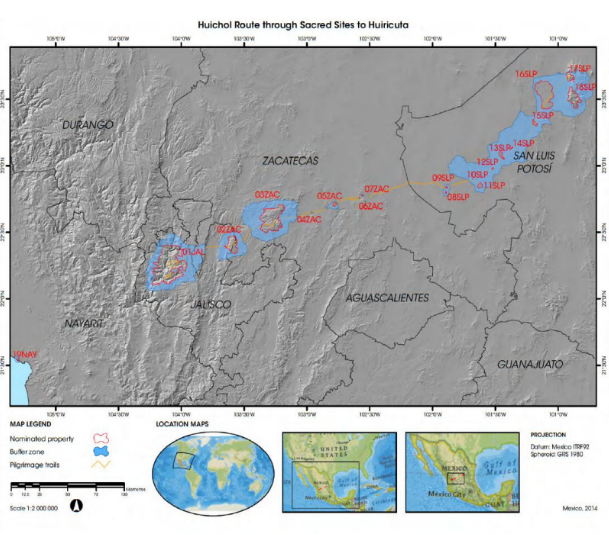 穿过圣地到达惠里库塔(塔特瓦里·华居耶)的维夏里卡线路【Wixárika Route through Sacred Sites to Wirikuta (Tatehuarí Huajuyé)】是一条贯穿墨西哥中北部、绵延500多公里的朝圣线路,遗产地包括沿途一系列与维夏里卡人的精神、仪式和文化习俗息息相关的神圣场所,以及具有神圣意义的山峰、湿地、湖泊、森林等自然景观,共20处构成要素。作为一个整体,这条文化线路穿越了墨西哥多个生态区域,其中一些区域具有生物多样性及景观植被多样性价值,也被认为具有重要的自然遗产价值。