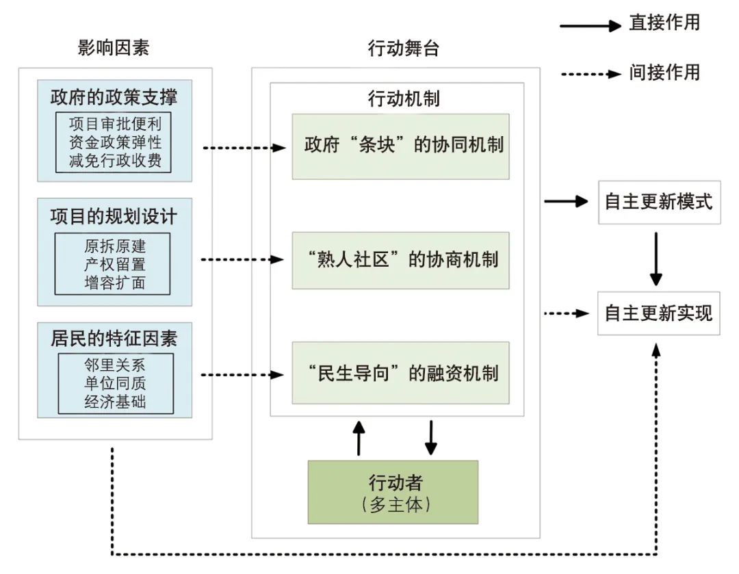 理论层面,学者们普遍认为自主更新模式具有显著优势,同时,面临着极大挑战。自主更新模式将最小产权者作为更新主体,具有资金平衡的经济优势,并且具有人居适宜、有机秩序等其他模式所欠缺的非经济优势,以及自主更新模式独特的容积率优势[5-6]。田莉[7]通过控制容积率和收益测算,发现在收益不变的情况下,自主更新模式能够大幅度降低容积率,在容积率提升的情况下,更新集体能够获得成倍提升的土地出让收益。然而,自主更新模式面临的主要难点在于居民协调成本巨大,如何解决集合住宅居民在更新意见上的分歧,是自主更新模式能否成为老旧小区改造主要模式的关键所在[8]。因此,解析自主更新模式的内在机制对于推动实践和理论发展具有重要意义。