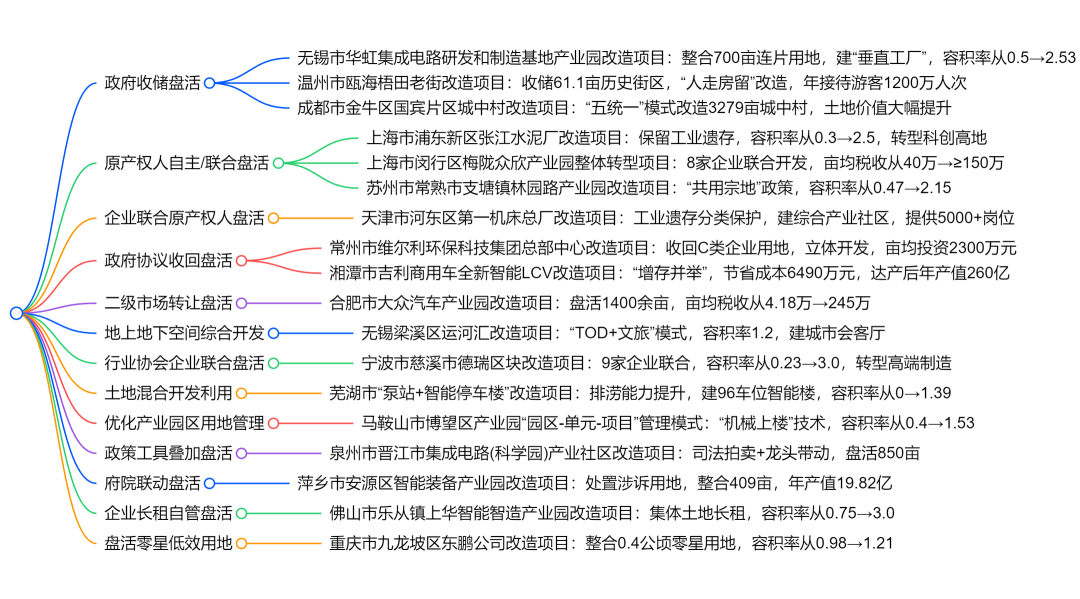 特点:市轻纺行业协会 9 家企业联合组建公司,通过司法拍卖取得破产企业用地,拆除重建后容积率从 0.23 提升至 3.0,转型为高端针织面料生产基地,带动传统产业升级。