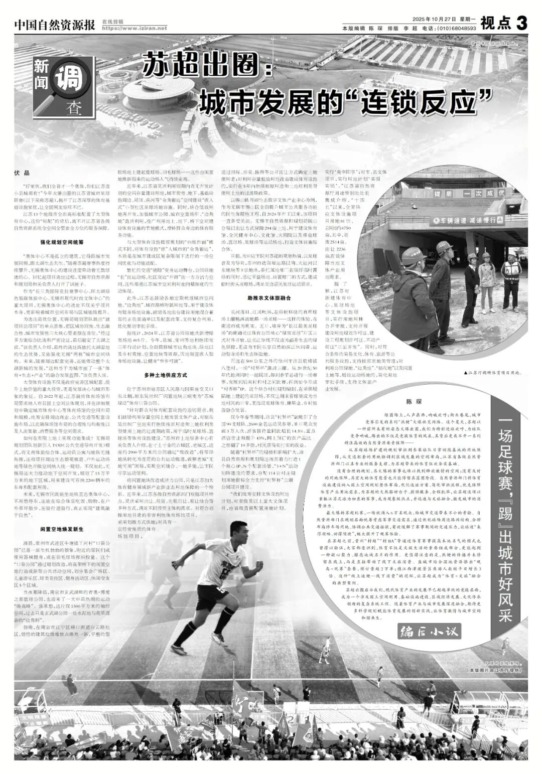 没有合理的规划,再火爆的赛事也难以找到释放激情的空间;没有及时的用地保障,再宏大的体育愿景也只能停留在蓝图阶段。自然资源部门将体育设施建设纳入国土空间规划整体布局,优化选址方案、简化审批流程,优先保障体育产业用地需求,为苏超的火热搭好台子、提供服务、全程托举,让苏超这项以重振江苏足球为初衷的赛事,成为现象级热点,并迅速与文旅融合,激发城市的消费活力。
