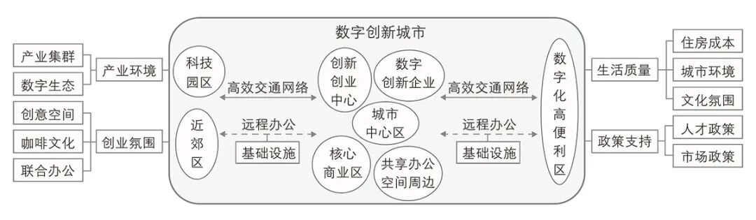 一是加强数字创业演化与城市空间重构的互动机理研究。结合区域科学相关前沿理论,探索数字创业生态系统与城市空间组织的互动机制,揭示数字创业活动集聚扩散的空间效应与作用机理,分析城市地理环境及空间组织对数字创业生态系统形成的影响机制,解读数字创业城市如何参与新思想、新技术、新企业的孕育和生产。