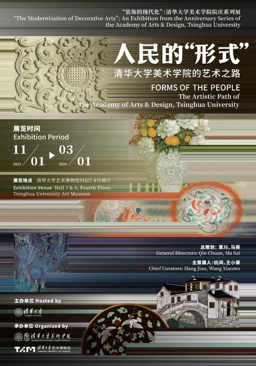 本次展览旨在追溯清华大学美术学院(原中央工艺美术学院)的艺术文脉。它所呈现的“装饰观”与“形式美”,构成了中国现代艺术探索中一条独特而重要的路径。展览分为两个部分、八个篇章。第一部分为人民的“形式”与艺术创造,包括“装饰”救国、时代“漫”画、中国新形象、“形式美”、民族重光、大雅民风、“风筝不断线”七个篇章;第二部分为人民的“形式”与国家视觉。