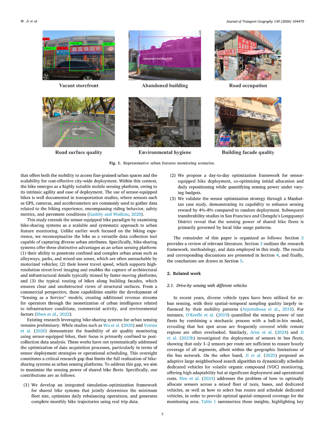 智慧城市的建设亟需面向社区级诊断的低成本、高效率感知方案。共享单车系统凭借其独特优势,成为实现城市特征监测的理想移动平台:它能够深入地块内部,扫描城市“毛细血管”;可依托自行车道,获取临街建筑无遮挡的正面视角;其低速行驶特性更有利于捕获稳定、清晰的街景影像,从而显著提升后续AI识别的准确率。在此背景下,本研究首次系统探索将共享单车作为移动感知平台的潜力。针对现有研究多集中于移动传感器采集后的数据分析、却忽视数据获取过程优化的问题,我们提出了一套集成仿真与优化的框架,能够同步实现共享单车车队规模最小化、日常再平衡运营调度,并生成完整的单车轨迹数据。此外,我们开发了传感单车部署优化模型,在给定预算约束下,通过协同决策传感单车的初始分配与每日调度策略进行部署。在曼哈顿的仿真实验表明,相较于随机部署,本研究所提策略能将感知收益提升4%至8%。在以月为监测频率的模式下,仅需100辆共享单车(约占车队总数的1%),即可覆盖81%的路段。在旧金山与成都龙泉驿区进行的迁移性实验表明感知效果在很大程度上受当地骑行模式的影响。本研究为细粒度城市管理提供了一种概念新颖、成本低廉且具备扩展性的感知解决方案。