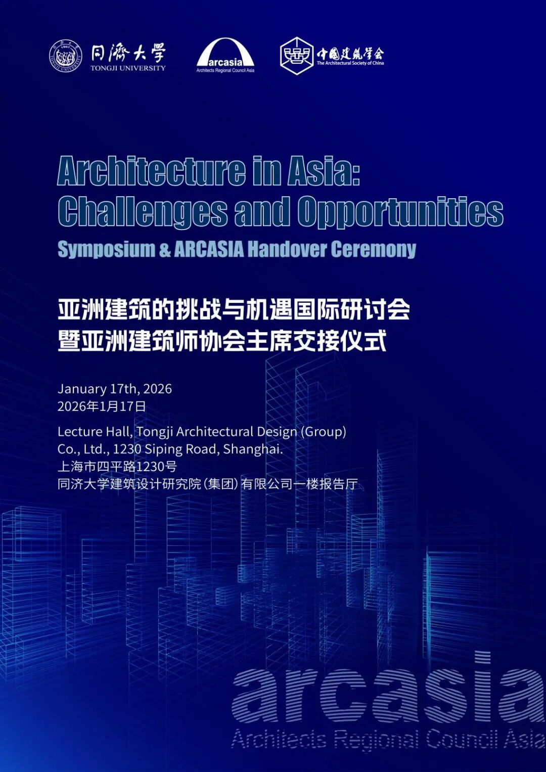 On January 17th, 2026, Tongji University and the Architectural Society of China will co-host an academic conference and the leadership handover ceremony in Shanghai. Actively responding to the “Belt and Road” Initiative, the conference will convene architects and scholars from ARCASIA member associations to focus on shared issues in Asian architecture and urban development, establishing a dialogue platform that transcends geographical, disciplinary, and practical boundaries. Based on a respect for Asian cultural diversity and regional nuances, the symposium is dedicated to promoting technological integration, institutional synergy, and the formation of shared values with Asian characteristics. Furthermore, it will delve into development pathways for the architectural industry tailored to contemporary challenges, such as high-density spatial governance, multicultural coexistence, and rapid socio-economic transformation.