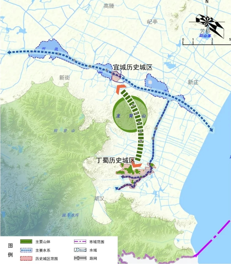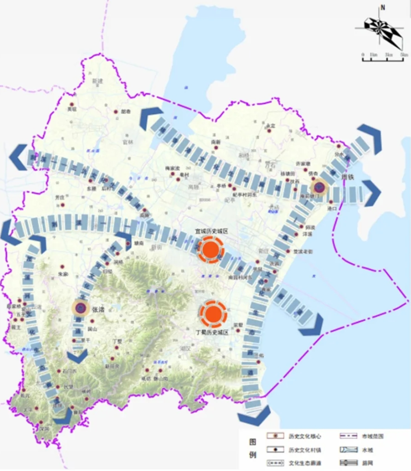 山氿一体 林洞相依 ——江南古城:依托宜南山区、东氿、善卷洞等自然禀赋,形成 “山湖氿相映” 的独特山水格局,凸显江南水乡与山林生态交融的城市风貌;