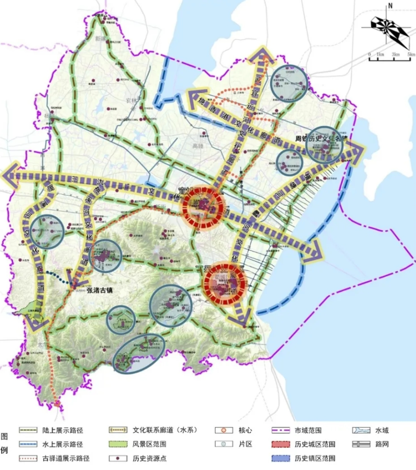 市域层面:规划三类展示路径(陆上、水上、古驿道)、七条文化廊道、两大核心(宜城、丁蜀历史城区)、八大区域,整合全域历史文化资源;