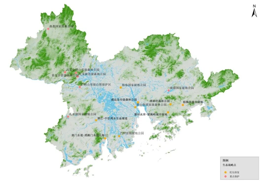 将生态战略点与《广东省国土空间规划2020-2035》《广东省国土空间生态修复规划(2021-2035 年)》以及粤港澳大湾区各城市国土空间规划和国土空间生态修复规划对于国土空间生态保护和修复的相关要求校核,我们发现: