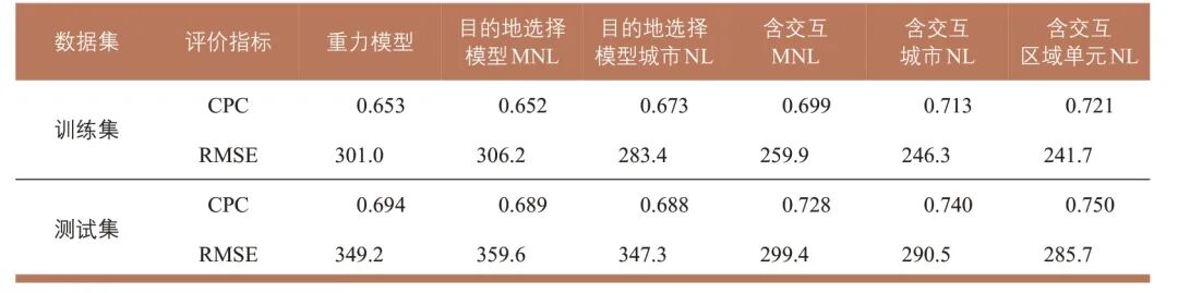 将此交互变量纳入候选变量集进行模型标定与验证,结果见表5 和表6。可以看出,GDPoxd系数较大且具有显著正向影响。MNL 模型测试集的CPC 从重力模型的0.694提升至0.728,NL 模型进一步提升至0.740;如果将Nest 按区域单元划定,CPC 可达0.750;测试集RMSE 较重力模型提升18%。这说明,即使在缺乏离散个体数据的情况下,引入有效的交互项仍能显著提升目的地选择模型在区域出行分布预测中的性能,使其优于重力模型。同时,Nest划分越符合实际决策结构,越能准确刻画出行选择行为。然而,若模型中缺失关键交互变量,NL 模型的表现可能反而不如MNL 模型。这是因为模型无法捕捉不同出发地居民的出行习惯差异,导致选择行为描述出现偏差,此时即便优化Nest结构也难以弥补这一缺陷。