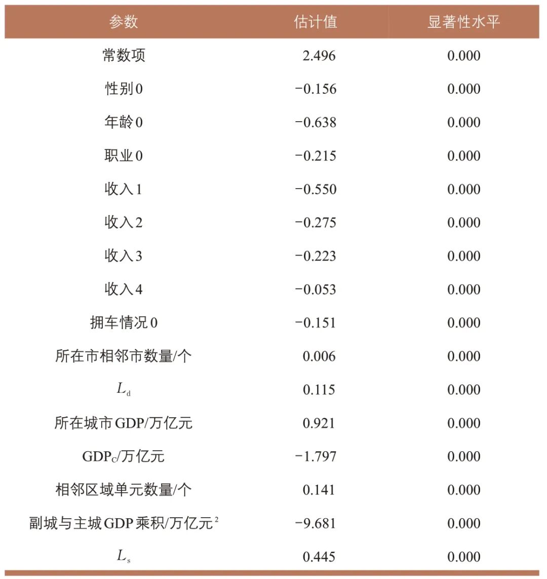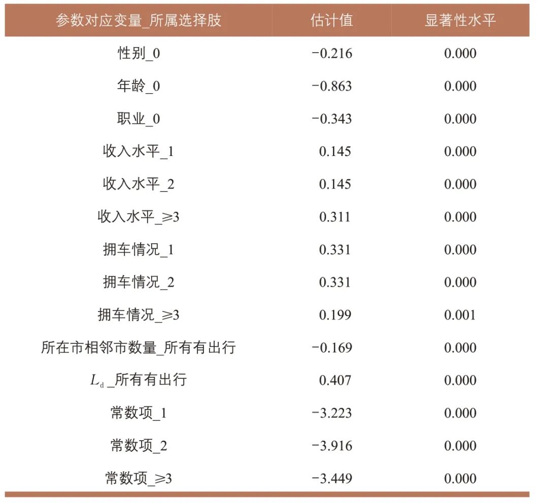 1)表中“所属选择肢”非该变量取值水平,同一变量可能出现在不同选择肢中;2)若以调整常数项方式按训练集的区县区域出行总量进行校正,则增加0次选择肢的常数项取值0.233。