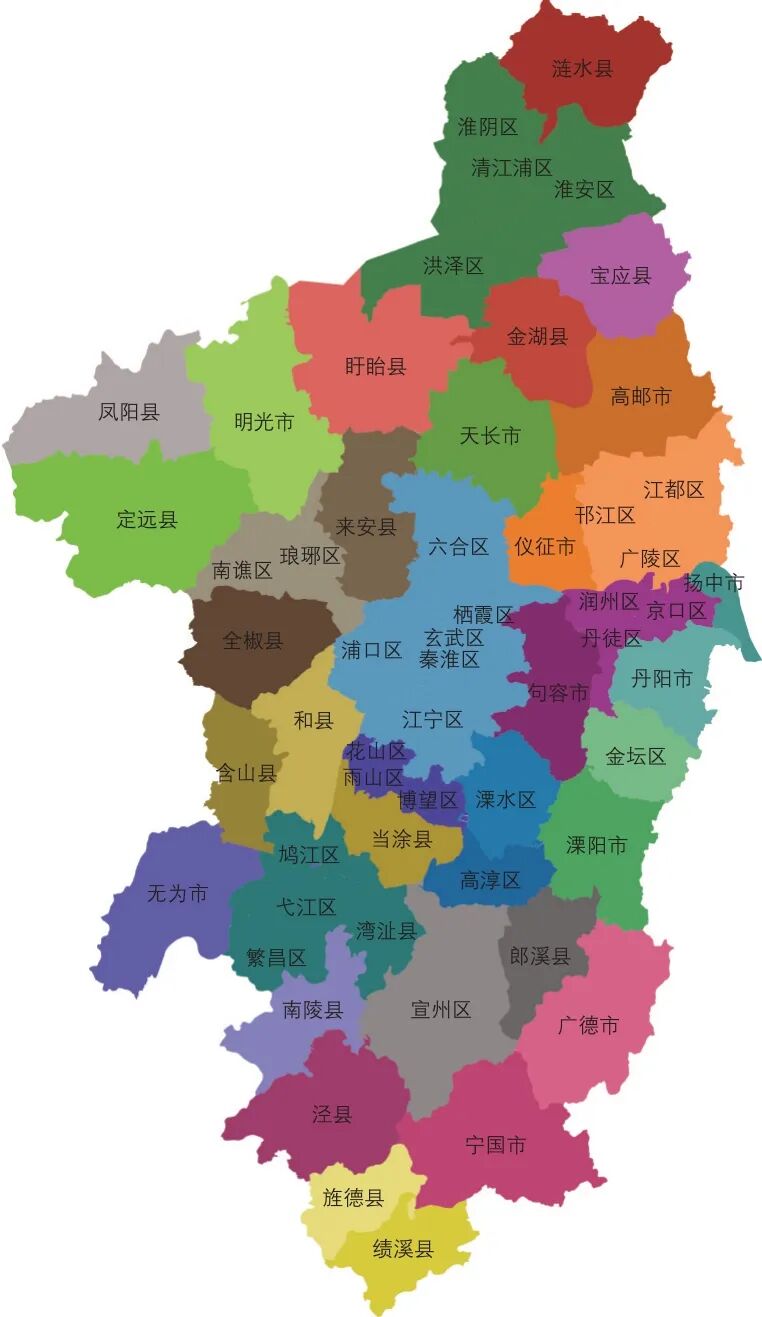 尽管图1 中主城和副城的范围可能与实际行政区划有所不同,但为便于实践应用和数据收集,仍将主城界定为地级市的市区,副城界定为所辖县或县级市(通常县或县级市相对独立,其与市区之间的出行规律已不同于日常通勤出行),并统称为区域单元。若某市仅由市辖区组成,则将其相对独立的区划定为副城。以南京都市圈为例:核心城市南京的副城包括溧水和高淳;都市圈内其他地级市的主城为市区,副城为所辖县或县级市。南京都市圈区域单元划分示意见图2(同颜色表示同一区域单元)。
