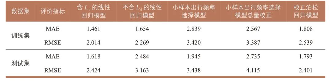 受限于问卷样本量,出行频率选择模型直接输出的区县人均区域出行次数与手机信令数据存在规模差异。常规做法是通过调整常数项使模型输出结果与观测值一致,但此类强行拟合数据可能损害模型的泛化能力。本文对比以下两种情形的模型效果:直接应用模型,以及通过调整“不出行”选择肢的常数项使训练集出行总量与真实值一致。结果如表2所示,可见不仅模型效果(对应“小样本出行频率选择模型”列)明显差于线性回归模型,常数项校正后效果(对应“小样本出行频率选择模型总量校正”列)进一步恶化。然而,这并不表明出行频率选择模型效果一定不如线性回归模型,而是反映出小样本调查数据难以准确标定复杂模型参数。这也说明常数项校正虽可勉强拟合当前数据,却可能削弱模型的预测能力。