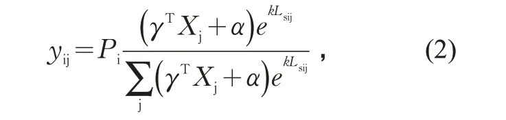 式中: yij 为区县i 至区县j 的日均区域出行去程出行量/(人次·d-1); Pi 为区县i 的日均区域出行去程总量/(人次·d-1);γT 为待估计系数列向量的转置;Xj 为表征区县j 出行吸引能力的自变量列向量;α 为常数项;k 为待估计参数;Lsij 为区县i 至区县j的Ls 值。