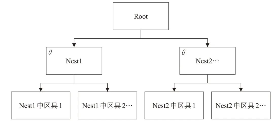 目的地选择模型是一种将各目的地作为选择肢的Logit 模型。若Root 层下仅包含单一层级(即直接对应区县级目的地),该模型为多元 Logit 模型(Multinomial Logit,MNL);若Root层下为嵌套结构(例如先连接城市层Nest,Nest 下再连接城市内各区县),则为嵌套Logit 模型(Nested Logit,NL)。目的地选择Logit 模型结构见图7。若NL 模型中所有Nest 的不相似参数(dissimilarity parameters,θ)均为1,则该模型等价于MNL 模型。目的地选择模型计算公式为:
