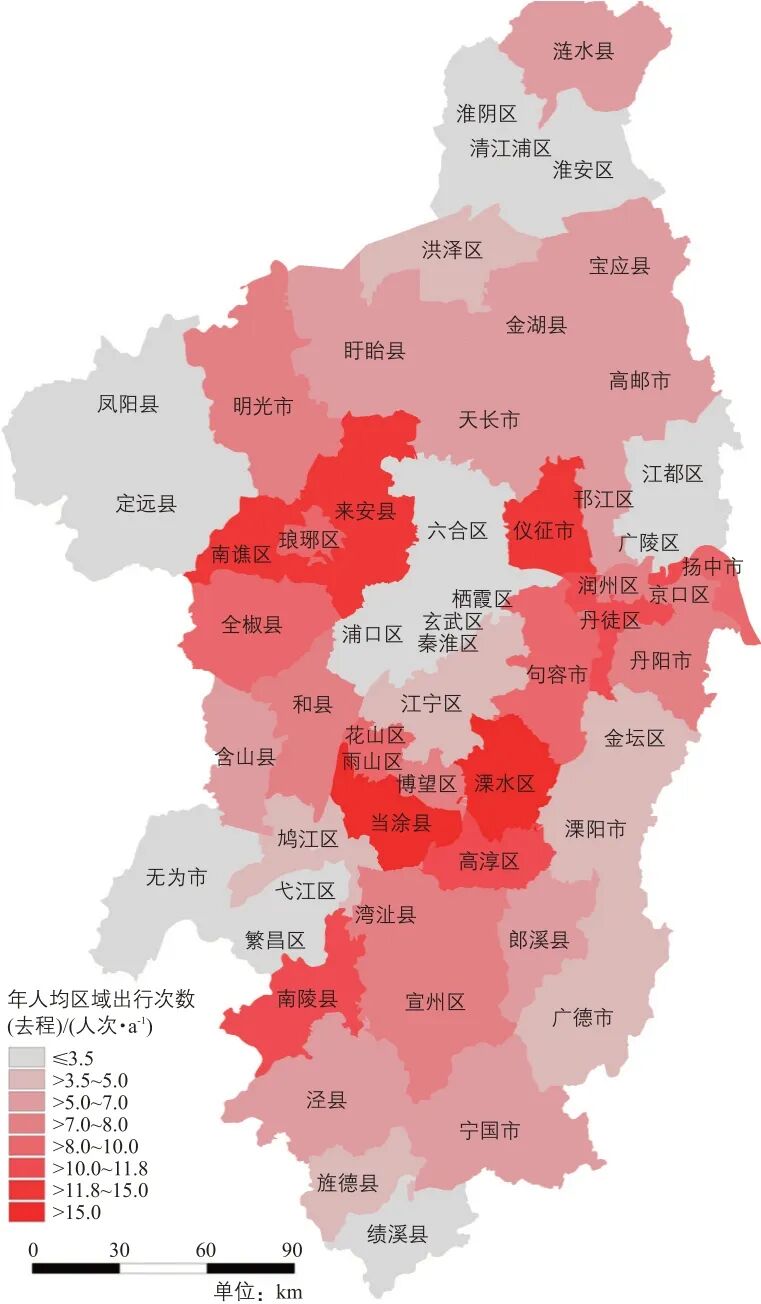 图3 基于手机信令数据的年人均区域出行次数(去程)