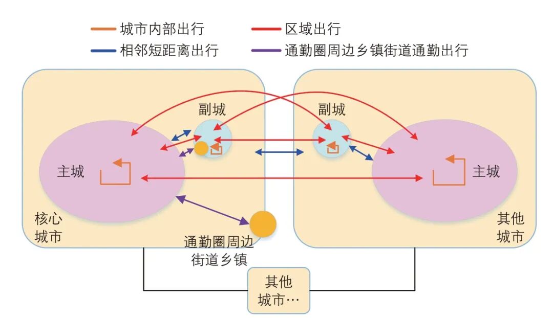 本文所界定的区域出行,主要指区别于城市内部出行的跨城出行。在都市圈范围内,该界定不包含进出都市圈的出入境出行及跨都市圈的过境出行。此外,虽然通勤圈周边乡镇街道的通勤出行以及相邻区域的短距离出行也跨越了行政区边界,但由于其属于日常出行范畴,性质上仍等同于城市内部出行,因此也不在本文的界定范围。都市圈区域出行界定示意见图1。