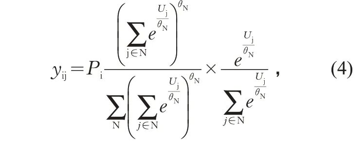 式中:Uj 为目的地区县j 的吸引力效用值,Uj=γTXj+kLsij;θN 为Nest 的不相似参数,取值范围(0,1],取值越接近1 表示该Nest 内各选择肢相互独立性越强,越小则表示相关性越高。