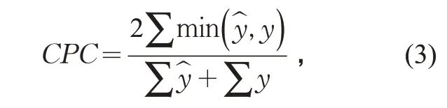 出行分布阶段各模型的评价指标见表6,采用通勤者共同部分指数(Common Part of Commuters, CPC)和RMSE 作为评价标准。CPC用于衡量预测值与真实值之间的一致性[16],其取值范围为[0,1]:预测与实际完全不一致时为0,完全一致时为1。CPC 计算公式如下: