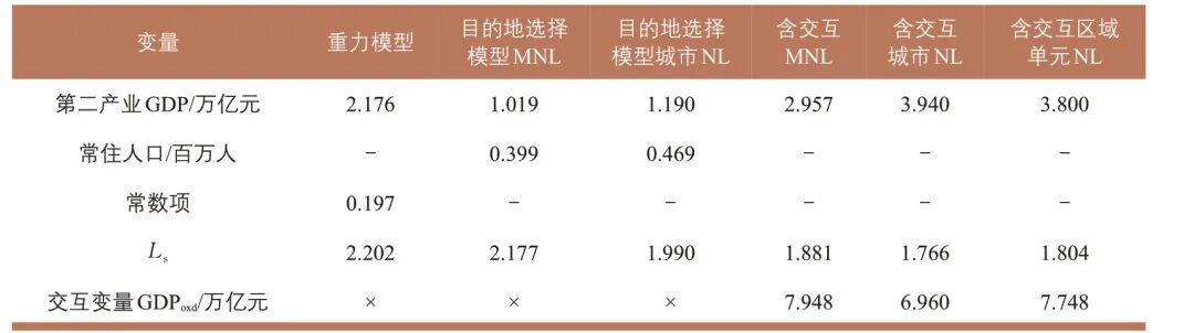 不同出发地的居民在选择目的地时存在偏好差异,这意味着起点与终点变量之间必然存在多种交互效应。为分析其中最主要的交互影响,本文考虑市域内主城与副城之间因行政隶属关系而产生的额外联系——出行生成阶段相关变量的有效性已初步印证这一点。据此,构建交互变量GDPoxd,其取值为起点区县与终点区域单元GDP 乘积的平方根;若起点与终点跨越地级市行政区,则该变量取值为0。