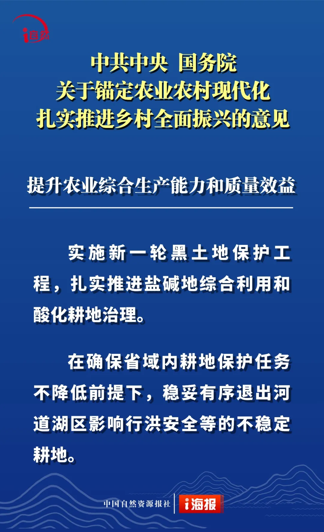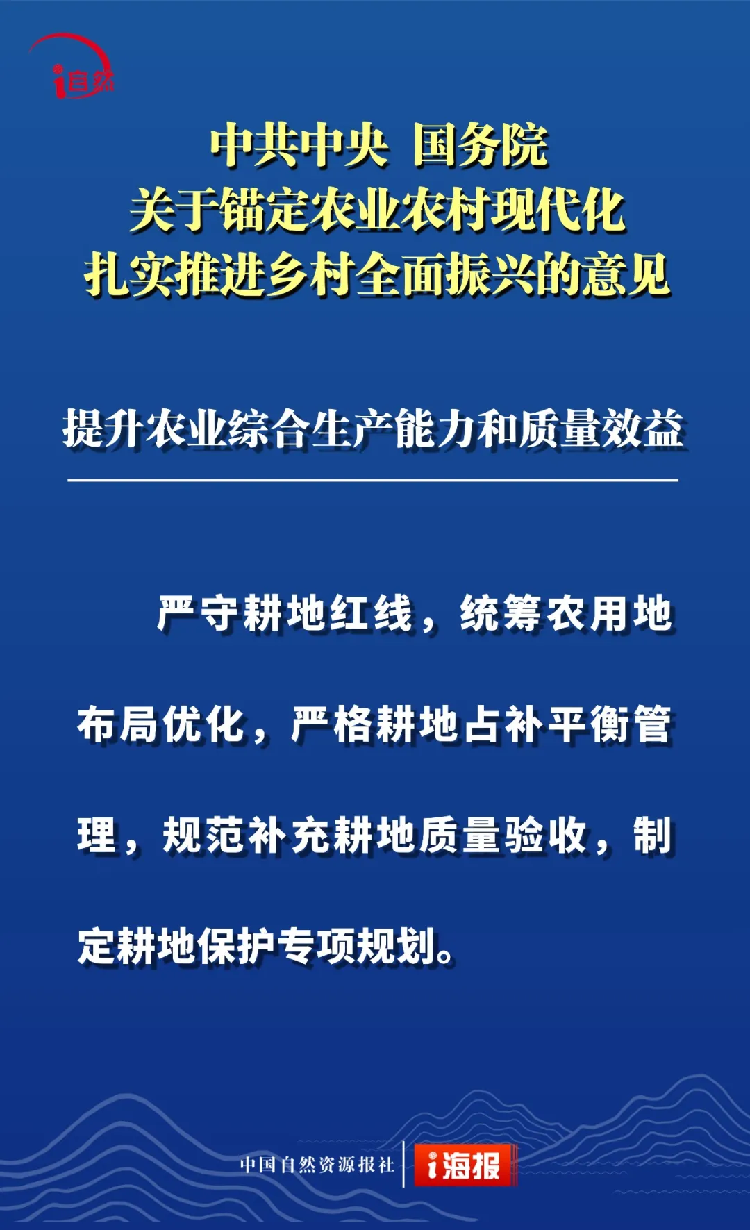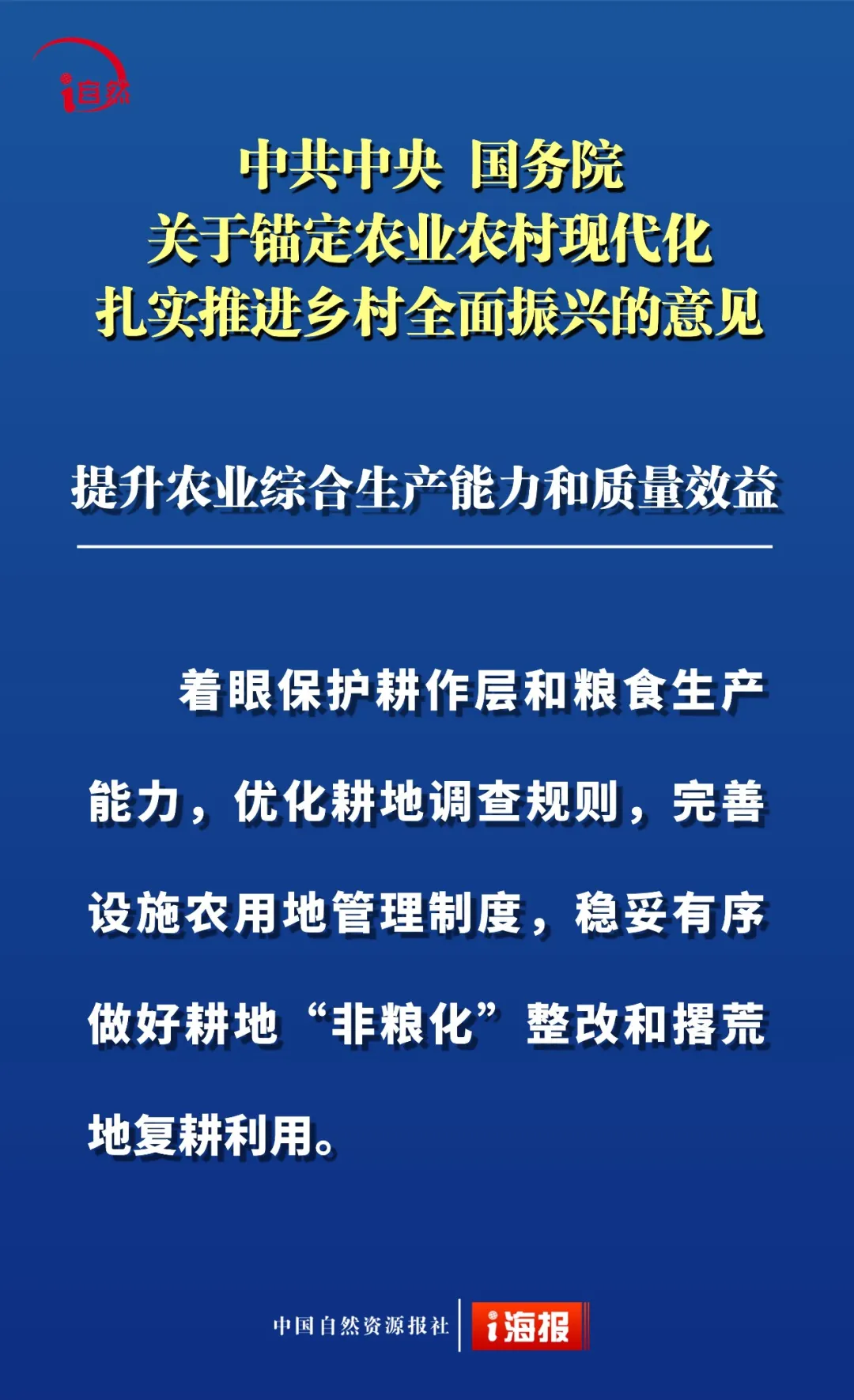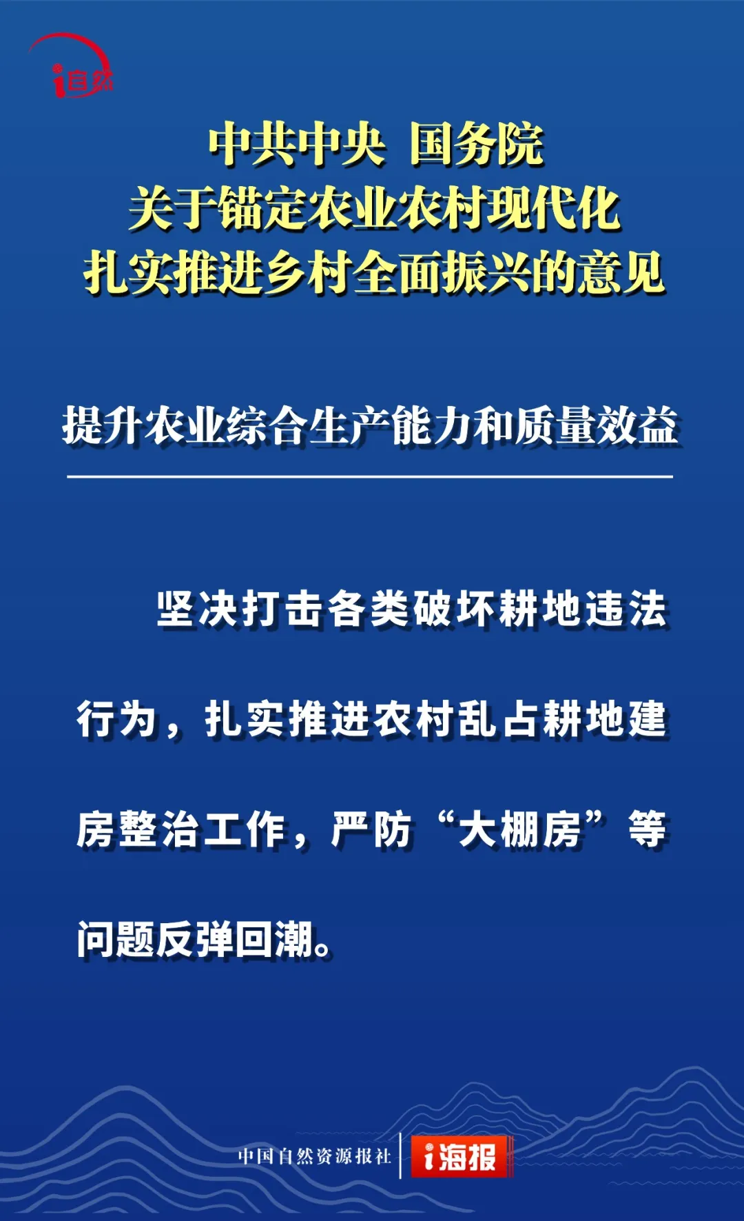点击蓝字 关注我们 2月3日 《中共中央 国务院关于锚定农业农村现代化 扎实推进乡村全面振兴的意见》 发布 这是“十五五”首个中央一号文件 也是党的十八大以来 第14个指导“三农”工作的中央一号文件 全文共分 提升农业综合生产能力和质量效益 实施常态化精准帮扶 积极促进农民稳定增收 因地制宜推进宜居宜业和美乡村建设 强化体制机制创新 加强党对“三农”工作的全面领导 六个部分 这份重磅文件中 有哪些涉及自然资源工作的内容 小编为您摘要梳理并制作成21张海报 或有疏漏,欢迎补充 ↓↓↓ 转载:i自然全媒体 原文始发于微信公众号(杭州规划和自然资源):21张海报,速读2026年中央一号文件中的自然资源工作