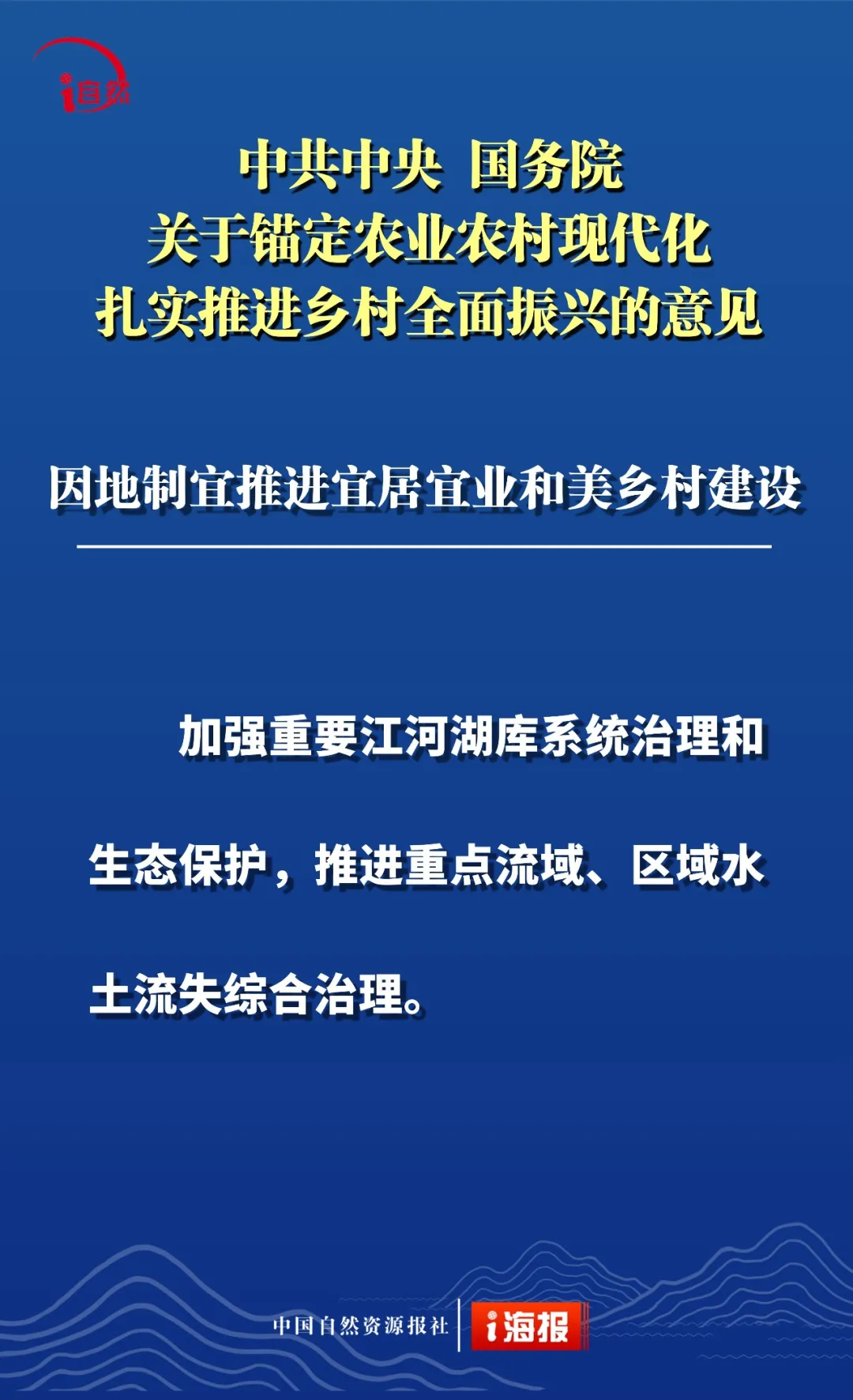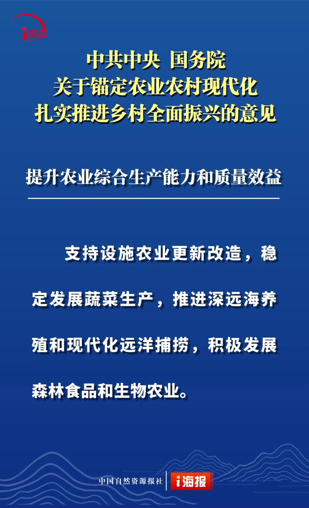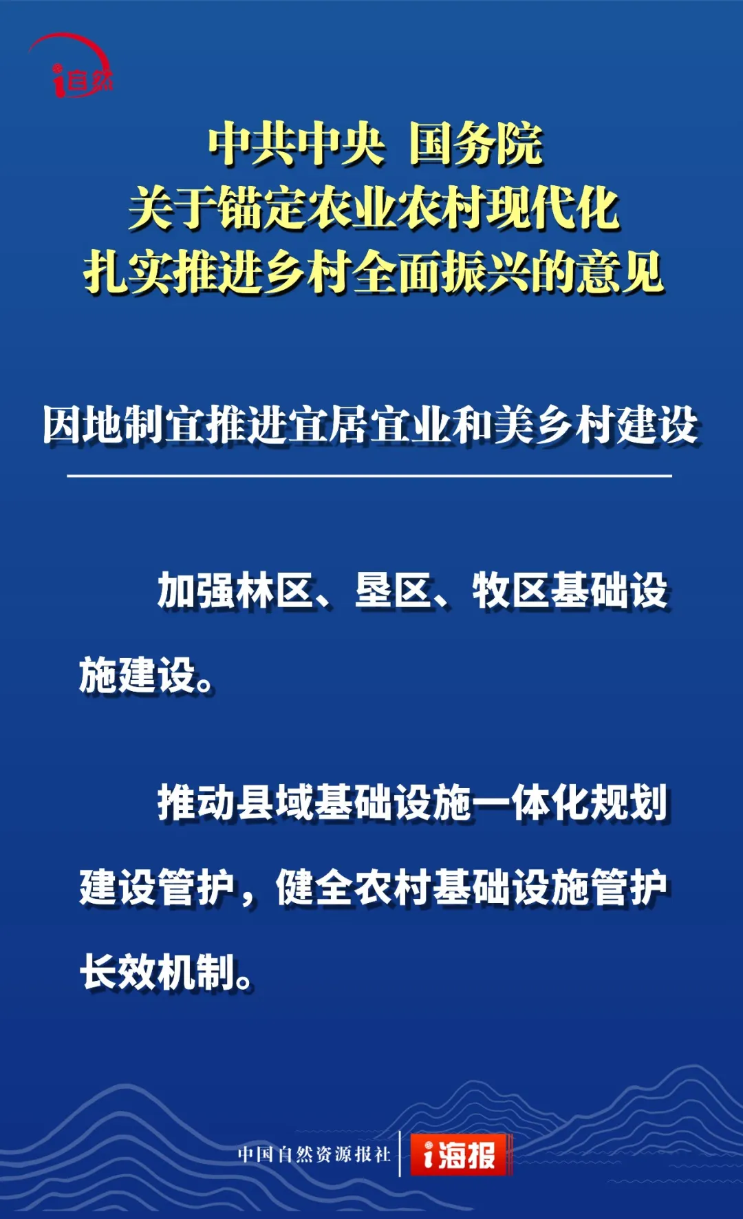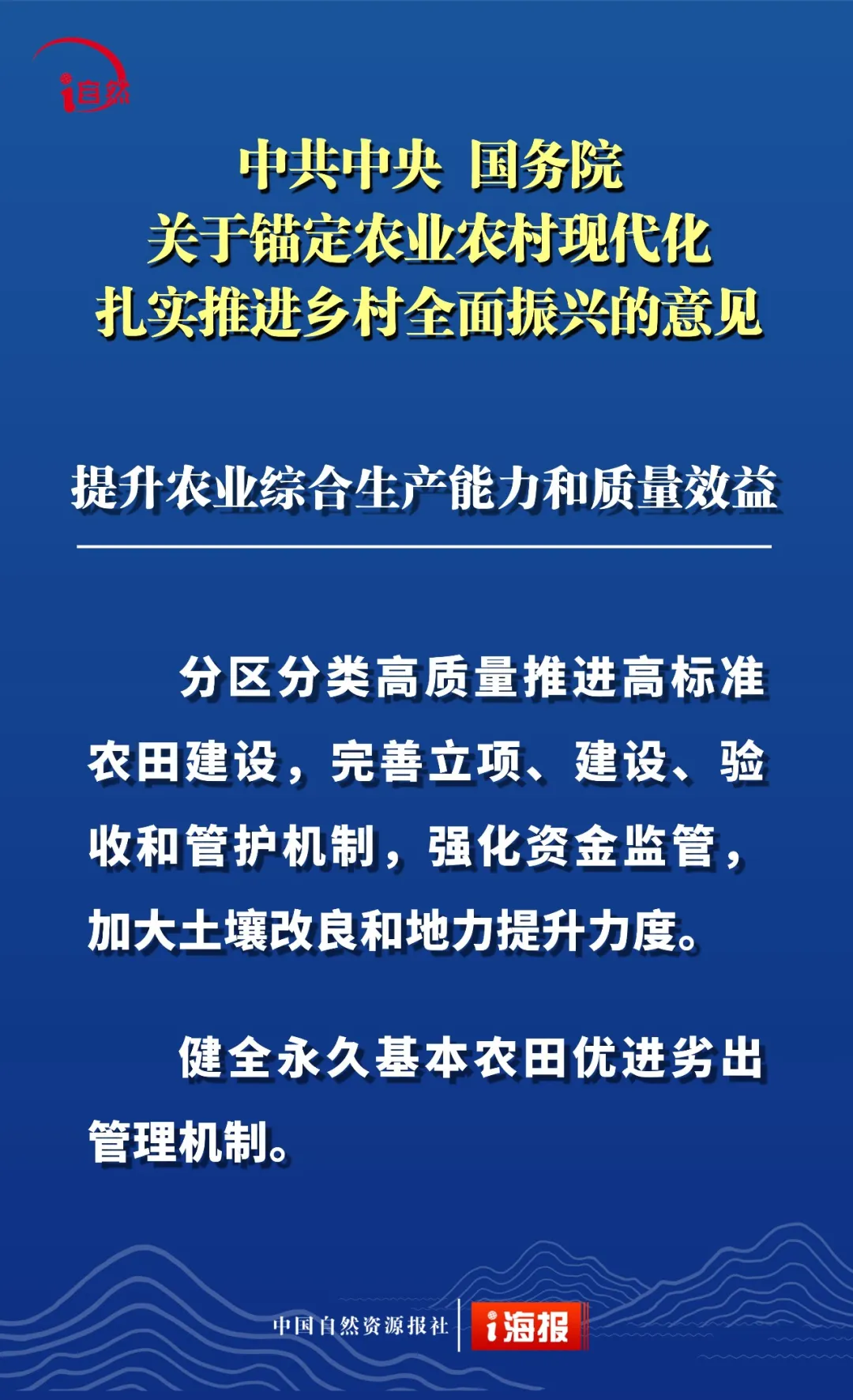 点击蓝字 关注我们 2月3日 《中共中央 国务院关于锚定农业农村现代化 扎实推进乡村全面振兴的意见》 发布 这是“十五五”首个中央一号文件 也是党的十八大以来 第14个指导“三农”工作的中央一号文件 全文共分 提升农业综合生产能力和质量效益 实施常态化精准帮扶 积极促进农民稳定增收 因地制宜推进宜居宜业和美乡村建设 强化体制机制创新 加强党对“三农”工作的全面领导 六个部分 这份重磅文件中 有哪些涉及自然资源工作的内容 小编为您摘要梳理并制作成21张海报 或有疏漏,欢迎补充 ↓↓↓ 转载:i自然全媒体 原文始发于微信公众号(杭州规划和自然资源):21张海报,速读2026年中央一号文件中的自然资源工作