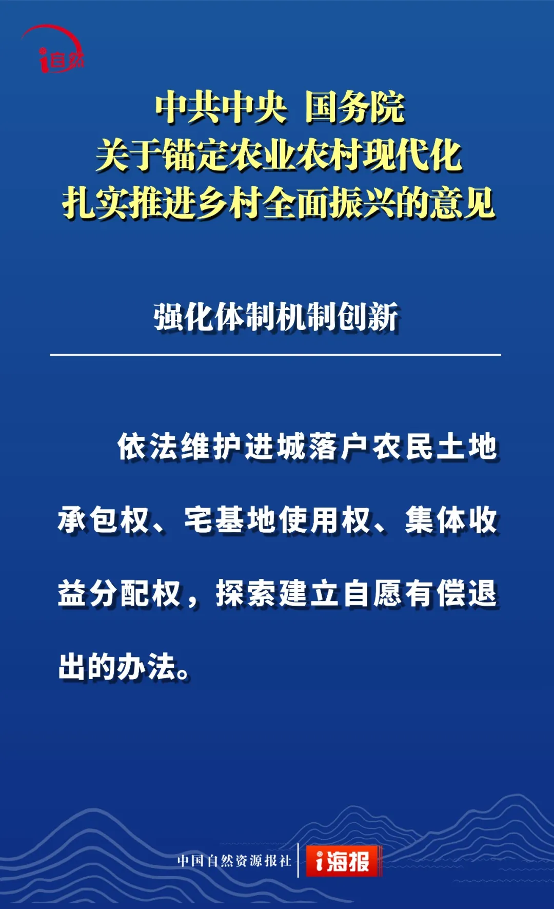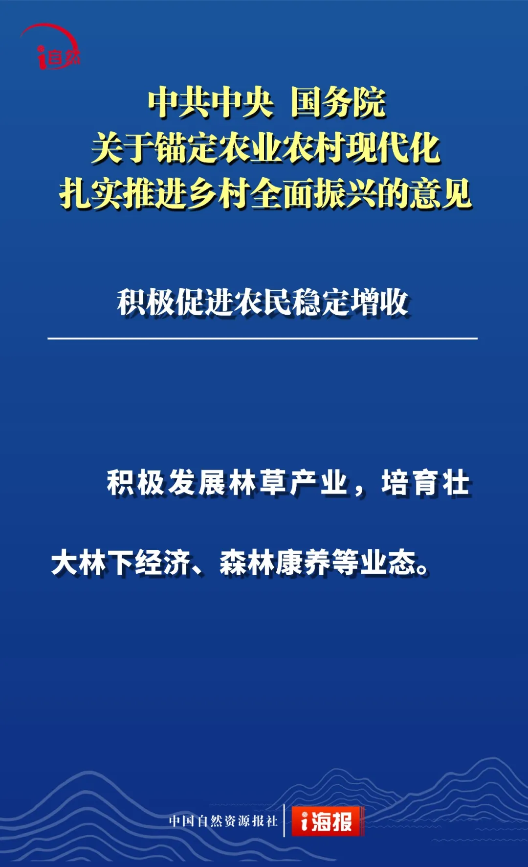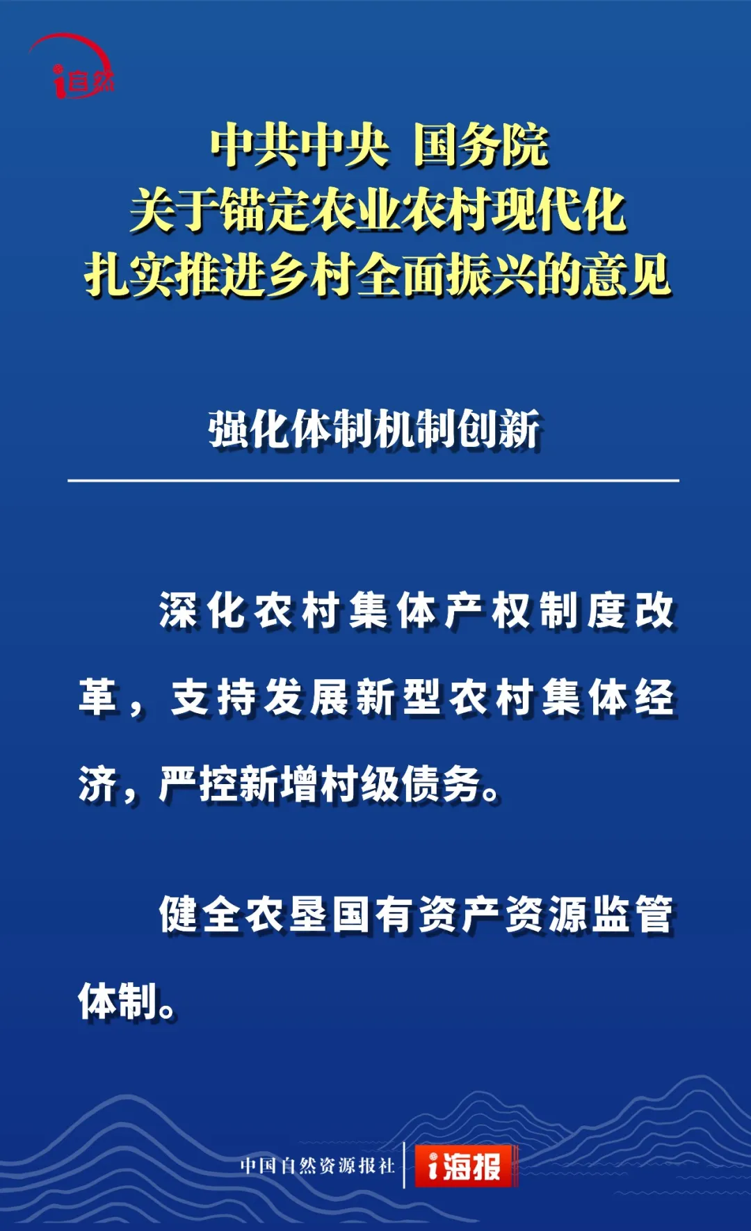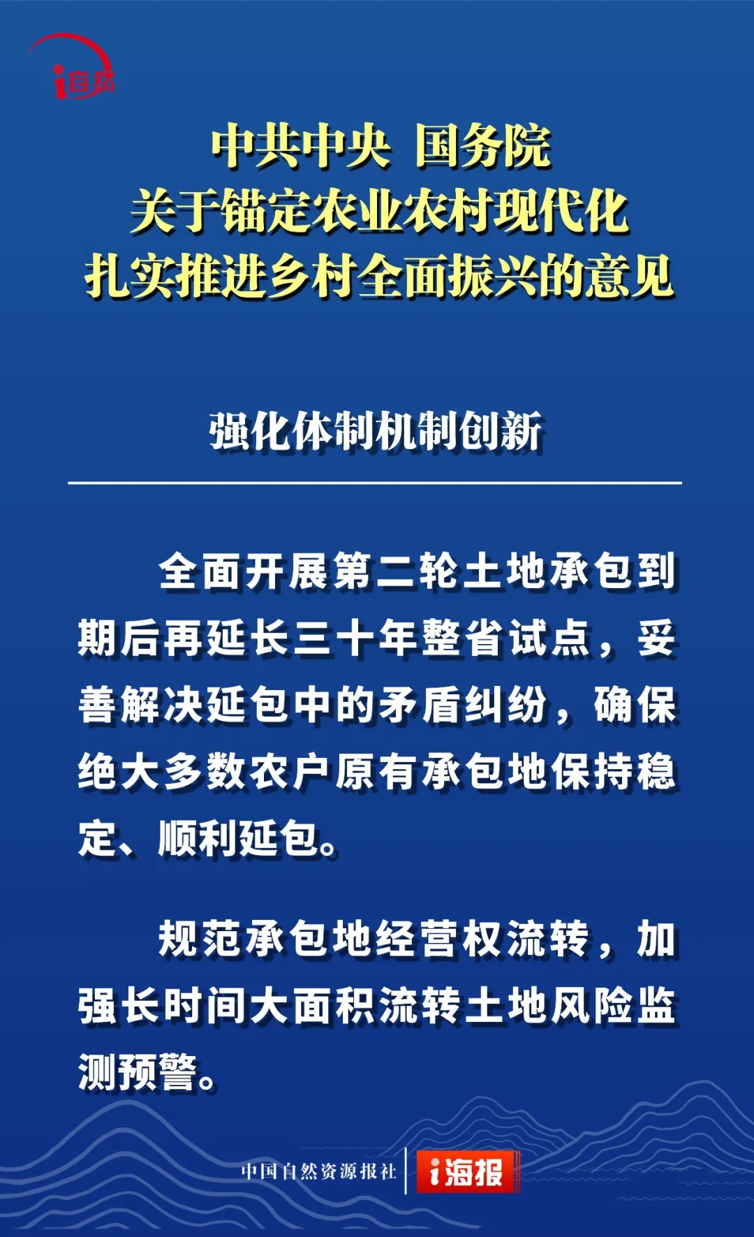 点击蓝字 关注我们 2月3日 《中共中央 国务院关于锚定农业农村现代化 扎实推进乡村全面振兴的意见》 发布 这是“十五五”首个中央一号文件 也是党的十八大以来 第14个指导“三农”工作的中央一号文件 全文共分 提升农业综合生产能力和质量效益 实施常态化精准帮扶 积极促进农民稳定增收 因地制宜推进宜居宜业和美乡村建设 强化体制机制创新 加强党对“三农”工作的全面领导 六个部分 这份重磅文件中 有哪些涉及自然资源工作的内容 小编为您摘要梳理并制作成21张海报 或有疏漏,欢迎补充 ↓↓↓ 转载:i自然全媒体 原文始发于微信公众号(杭州规划和自然资源):21张海报,速读2026年中央一号文件中的自然资源工作