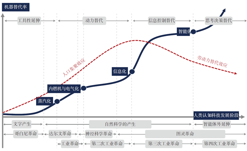 (2)动力替代阶段(第一、二次工业革命):蒸汽机与电力的广泛应用使得机器获得独立动力,人类劳动力的能源价值几乎被机器所完全替代。人的价值更多转向技术领域。