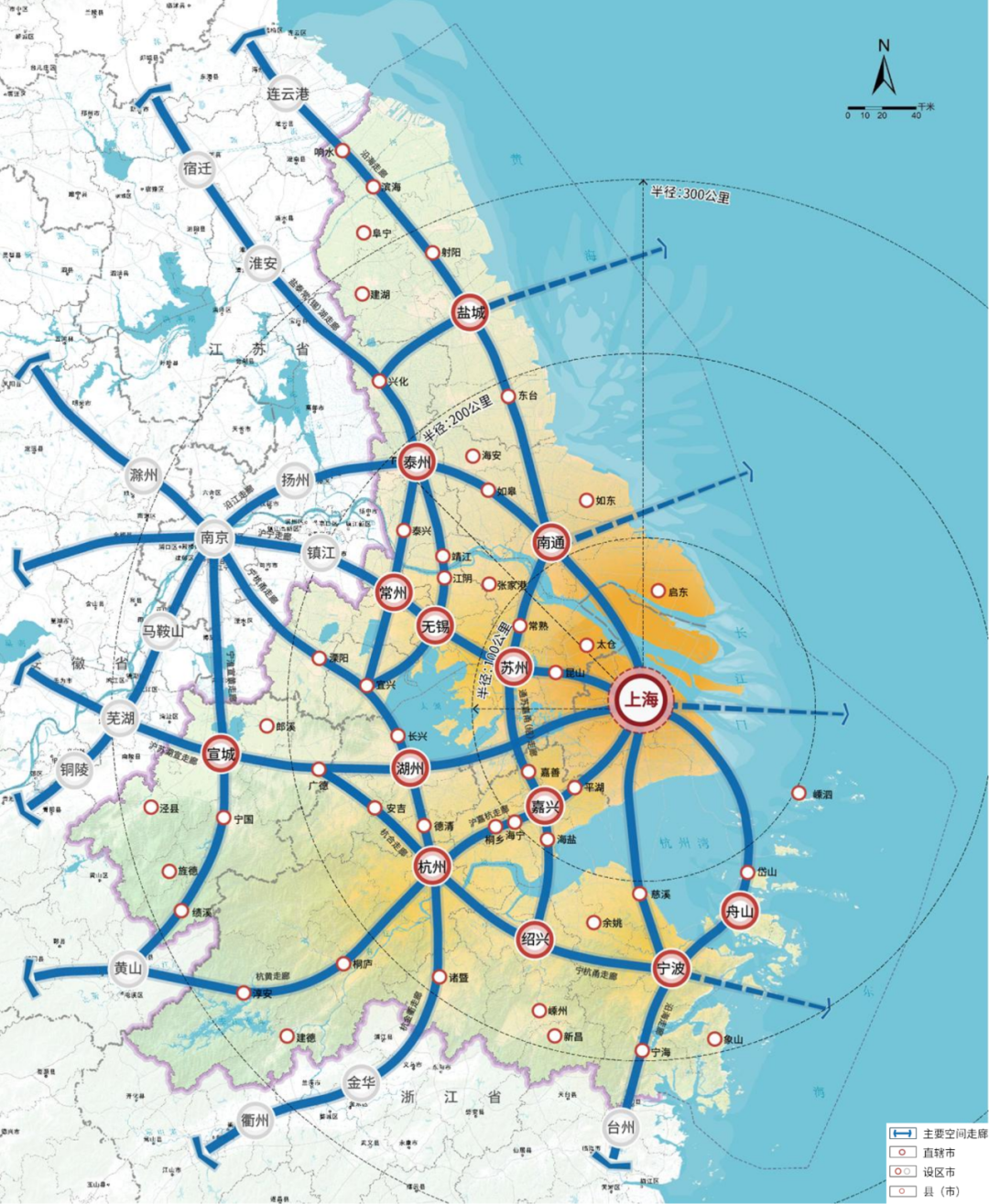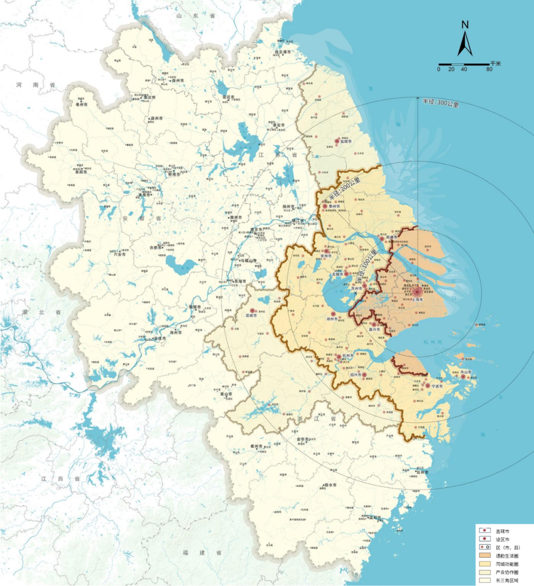 同城功能圈:上海及周边同城化紧密地区,覆盖上海主城区中心向外约200 公里,陆域面积约6.9 万平方公里,构建一小时交通圈,强化产业链、创新链等集成集聚;