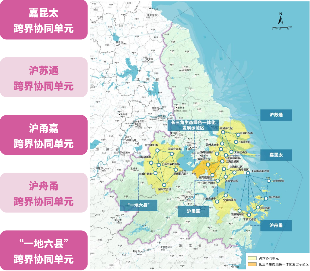 规划复制推广长三角生态绿色一体化发展示范区经验,划定 嘉昆太、沪苏通、沪甬嘉、沪舟甬、“一地六县” 五大跨界协同单元,以省际毗邻县级行政单元为核心,按照共筑格局、共保底线、共享发展、共塑标准的导向,推动空间协同布局和治理。