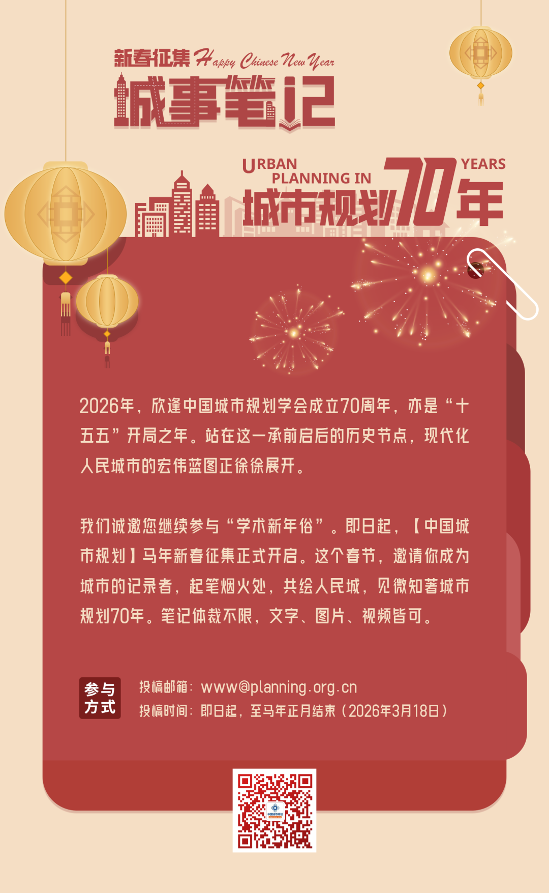 作为“城市规划70年”的系列活动之一,2026年【中国城市规划】新春征集即日启动,欢迎大家踊跃投稿(文字、照片、视频等形式均可),投稿邮箱:www@planning.org.cn。