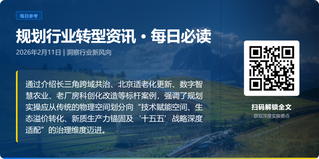 导读:本期资讯梳理了2026年2月11日规划行业在区域协同、城市更新、新质基建、乡村振兴、产业空间、绿色转型及政策衔接等七大领域的值得关注的信息,通过介绍长三角跨域共治、北京适老化更新、数字智慧农业、老厂房科创化改造等标杆案例,强调了规划实操应从传统的物理空间划分向“技术赋能空间、生态溢价转化、新质生产力锚固及‘十五五’战略深度适配”的治理维度迈进。