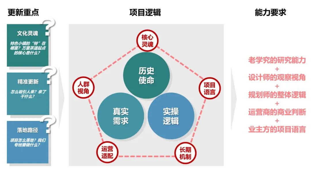 本项目基于对《大国清实施型城市设计》项目实践中对文旅地区存量更新的思考,探讨从顶层设计到落地运营的技术方法和实施路径。第一阶段确立可操作的整体结构,通过“双减双增”明确空间优化方向,锁定核心格局。第二阶段将结构转化为可实施的项目库,明确项目包、投资主体与建设时序,确保蓝图具备抓手。第三阶段提炼可招商的场景清单,通过活动预埋、业态导入与运营设计,吸引社会资本,实现项目的持续生长与活力注入。该方法体系确保了规划从战略到实施、再到可持续经营的全过程贯通。