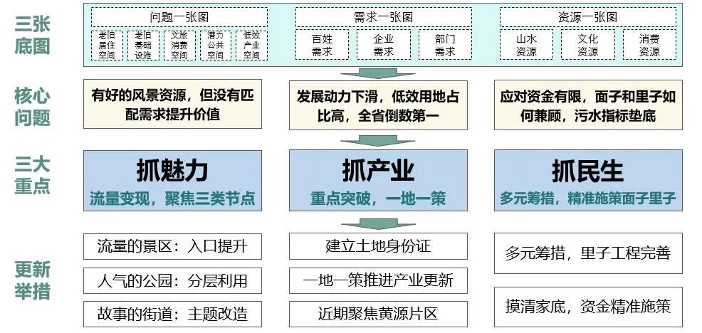 政府端以提升治理效能为核心,构建“规划-项目-政策-资金”四梁八柱:搭建专委会、更新联盟等专业支撑平台链接资源,建立“城市体检-专项规划-片区策划-项目实施”规划传导体系系统谋划,通过“政策+项目+资金”组合拳破解实施堵点。市场端以更新片区为载体,创新民生补短、功能提升、特色魅力等差异化模式,依托多元融资与专业运营赋能,激活存量空间价值。