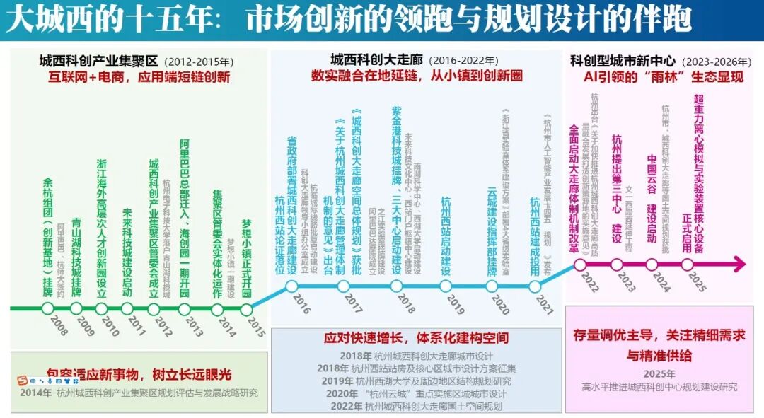 杭州城西从城市“后花园”到“科创西拓”战略的核心承载区,总体发展呈现三个特征阶段:2012-2015年电商野蛮生长、2016-2022年“数字+”硬核成长、2023-2026年“AI+”生态构建。随着产业赛道的迭代升级,创新链条从应用端到策源端、再转向全链布局,空间上呈现出小镇、创新圈、集群地区的演变,人才政策也从侧重“给补贴”,进阶到“给服务”“给生态”。在规划实践伴随过程中,初期包容成长、中期系统建构、后期精准织补,核心是坚持以需求为引领、动态响应,角色身份逐步从参谋家、工程师向主理人转型,遵循市场创新规律,针对性地进行空间供给与优化。