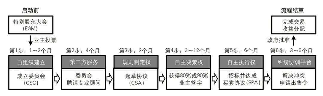 CSC会聘请专业顾问对物业进行市场评估,并制定出售策略、起草集体出售协议。此外,CSC还需发布招标信息寻找买家,评估投标并与开发商达成买卖协议。最终申请集体出售令,若少数业主反对,分层地契委员会(STB)协调解决。获得批准后完成交易,并按协议分配出售款项,整个流程通常需一年半的时间(图3)。