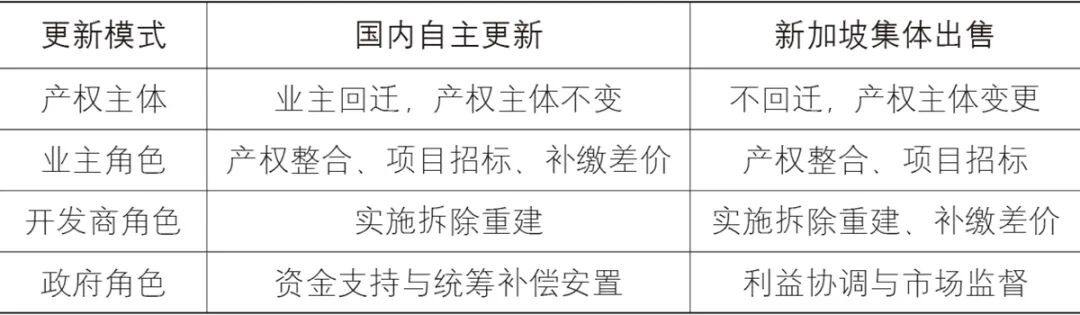 中国自主更新是在产权主体不变的前提下,产权人自发组织、自负盈亏的私人物业更新模式。相较之下,新加坡集体出售推动的城市更新由居民和开发商主导。社会主体和市场主体直接进行交易,充分发挥社会自组织力量和市场机制的作用,而政府主要起到协调支持和监督约束的作用(表2)。