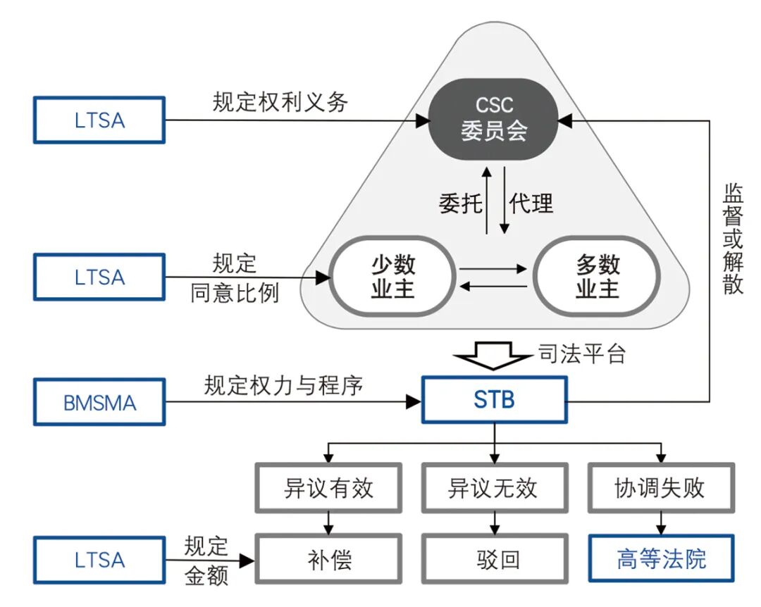 集体出售面临的集体行动困境主要有两方面:一是业主与CSC委员会之间的委托—代理问题,二是少数反对业主与多数同意业主之间的纠纷。为保障程序公平,新加坡政府通过《建筑维护和分层管理法》和《土地产权(分层地契)法》两部法律及“分层地契委员会”(STB)准司法机构进行协调。STB专门处理分层物业管理和集体出售的争议,确保利益冲突得到解决。
