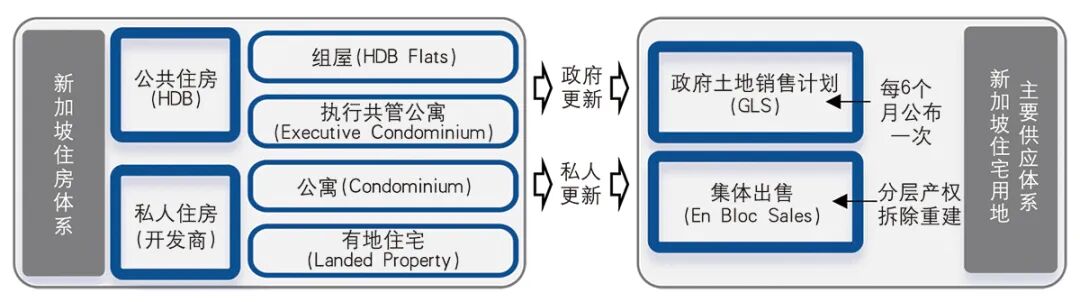 新加坡住房分为公共住房和私人住房,公共住房的重建由HDB负责。对于公寓而言,若所有业主联合出售整个物业,买家(开发商)可同时获得住房和土地,这种方式称为“集体出售”(图1)。