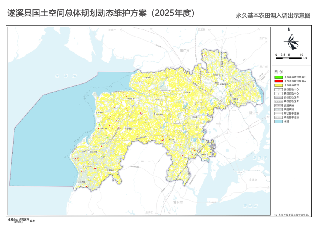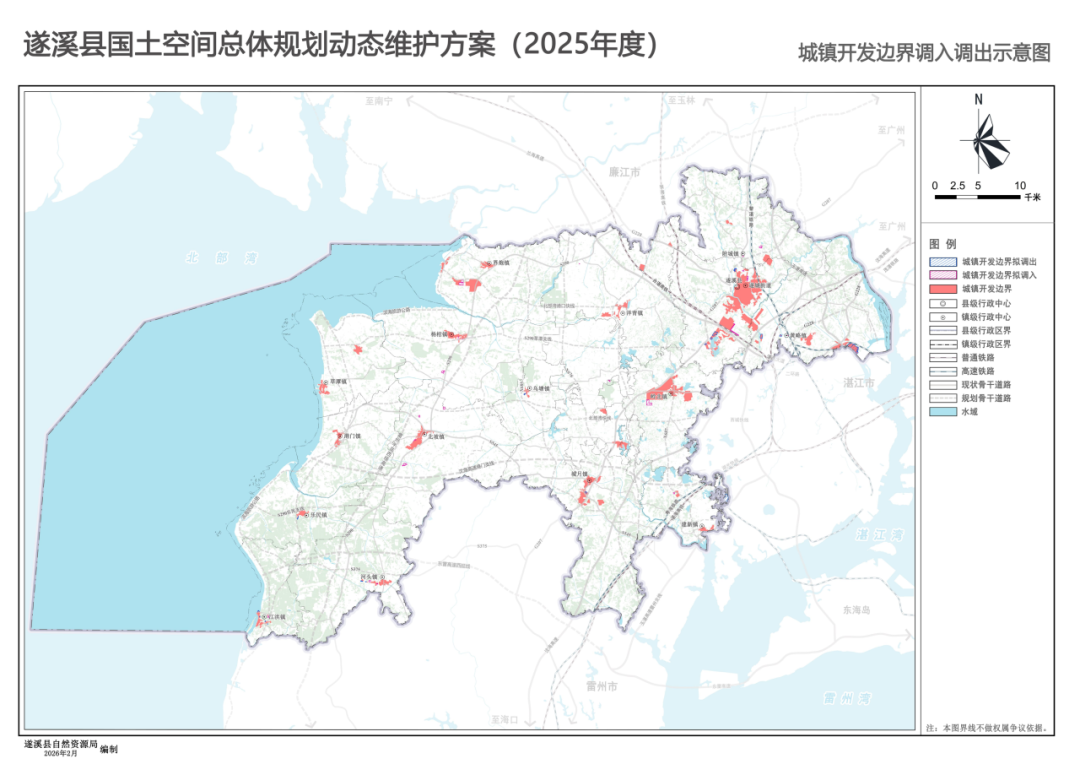 2026 年 2 月,遂溪县自然资源局发布《遂溪县国土空间总体规划动态维护方案 (2025 年度)(草案公示稿)》,本次动态维护以遂溪县国土空间总体规划 (2021-2035 年) 2024 年度体检评估报告结论为基础,严格依据《广东省自然资源厅关于印发 的通知》(粤自然资 函〔2026〕51 号)要求开展编制工作。