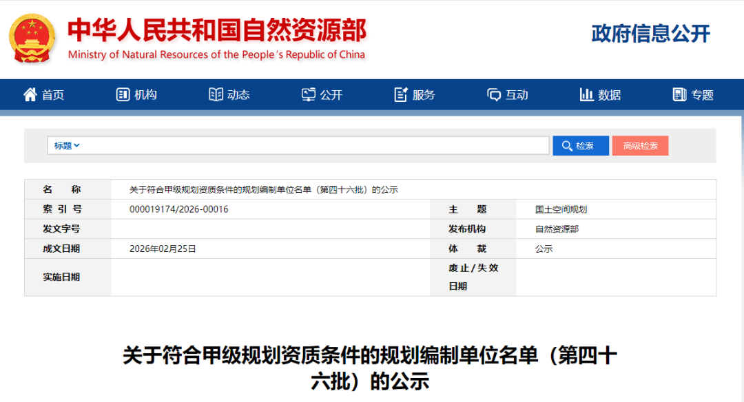 按照《中华人民共和国城乡规划法》《中华人民共和国行政许可法》及有关规划编制单位资质管理规定,我部对申请甲级规划编制资质单位的材料进行了审核,现将经审核符合甲级规划资质条件的规划编制单位名单(第四十六批)在部门户网站(http://www.mnr.gov.cn/)予以公示,公示期为10个工作日,从2026年2月26日至2026年3月11日。
