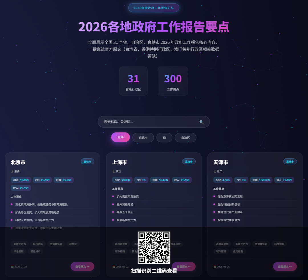 以上内容根据全国 31 个省、自治区、直辖市 2026 年政府工作报告核心内容整理,台湾省、香港特别行政区、澳门特别行政区相关数据暂缺。具体内容以官方数据为准,官方链接可以点击文末阅读原文查看。