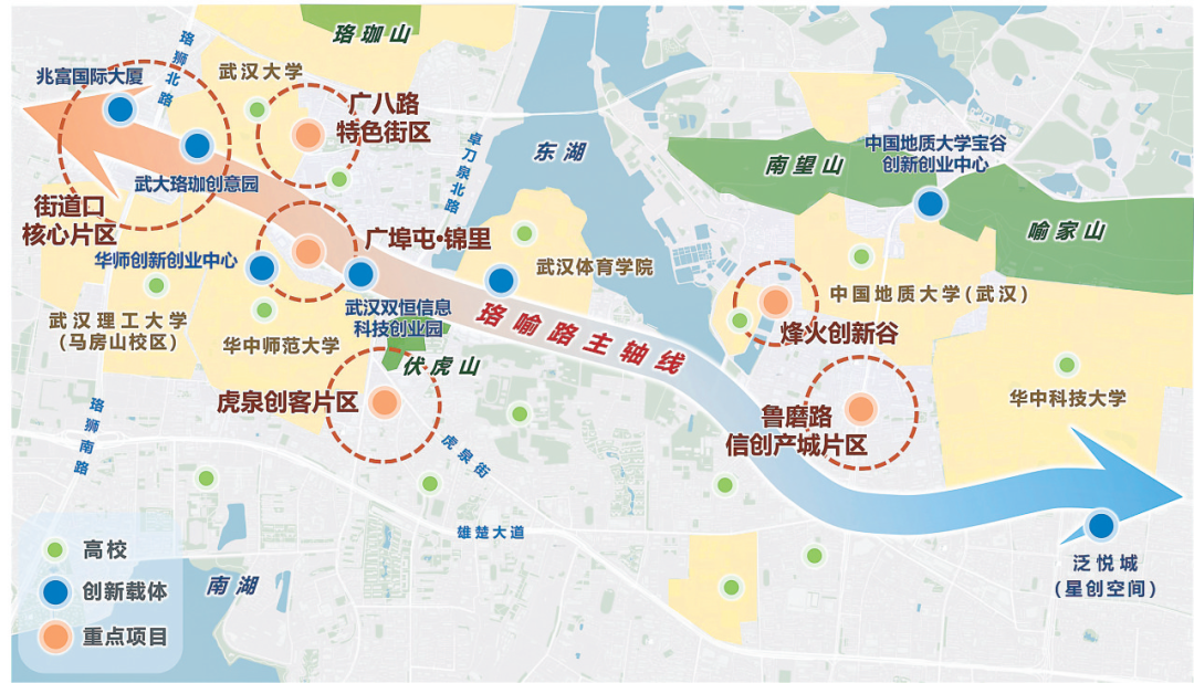 一带引领:以环大学创新发展带为核心,将 “山水硅巷” 打造为区域创新核心品牌,全面提升洪山区在武汉市科技创新版图中的创新枢纽地位,推动高校智力资源与城市发展资源深度融合。